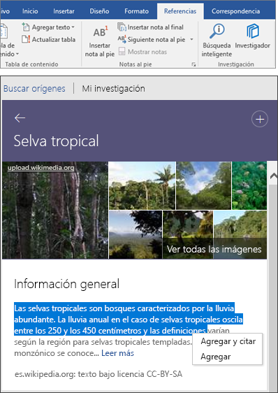 más información, vea Realizar investigaciones fácilmente para los trabajos desde Word
